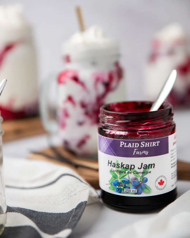 Haskaps ripen for only a brief window in early summer, making this jam a way to enjoy their bold flavour year-round. Each jar reflects the character of the fruit grown at Plaid Shirt Farms.
